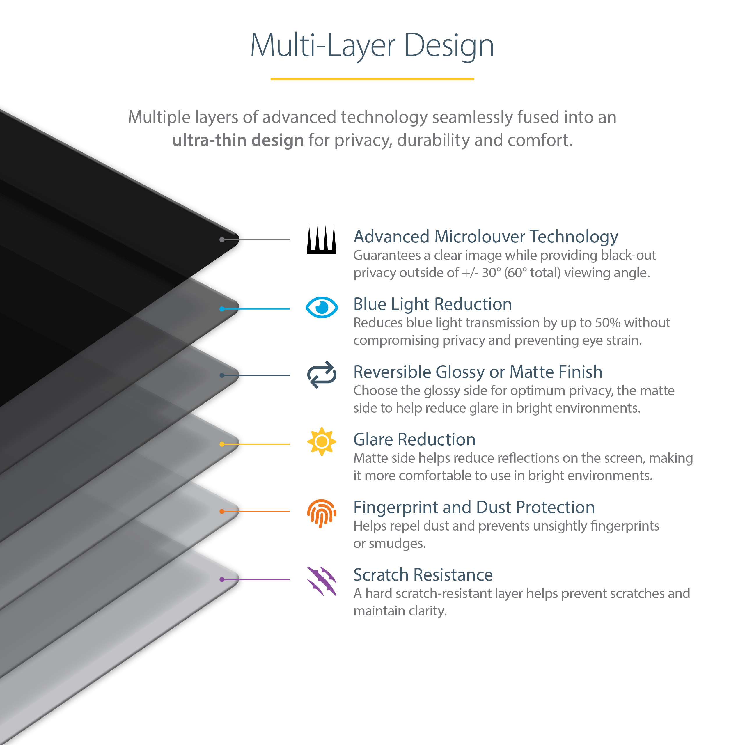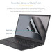 The privacy screen protector is reversible, with an anti-glare matte side for environments prone to glare and a high-gloss side that helps retain color vibrancy. The matte side provides additional screen protection with a fingerprint-resistant coating.