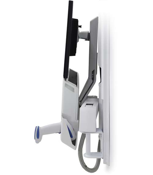 Holds a monitor, bar-code scanner, keyboard, wrist rest and mouse on the same arm, providing easy, single-motion height adjustment. Work sitting or standing with the arm’s ergonomic 25" (64 cm) LCD height adjustment range. A unique cable management system conceals and organizes cords, making cleaning easy.