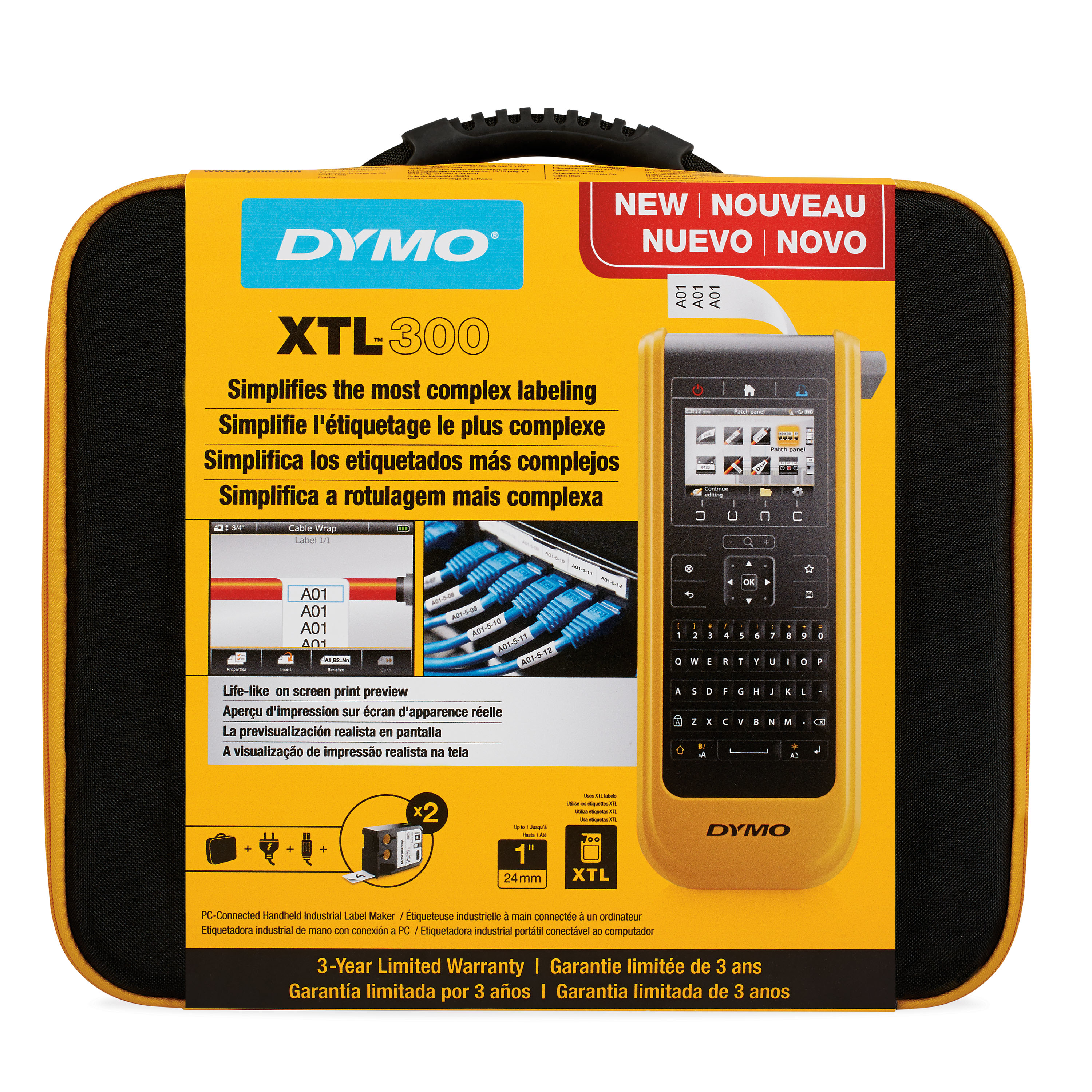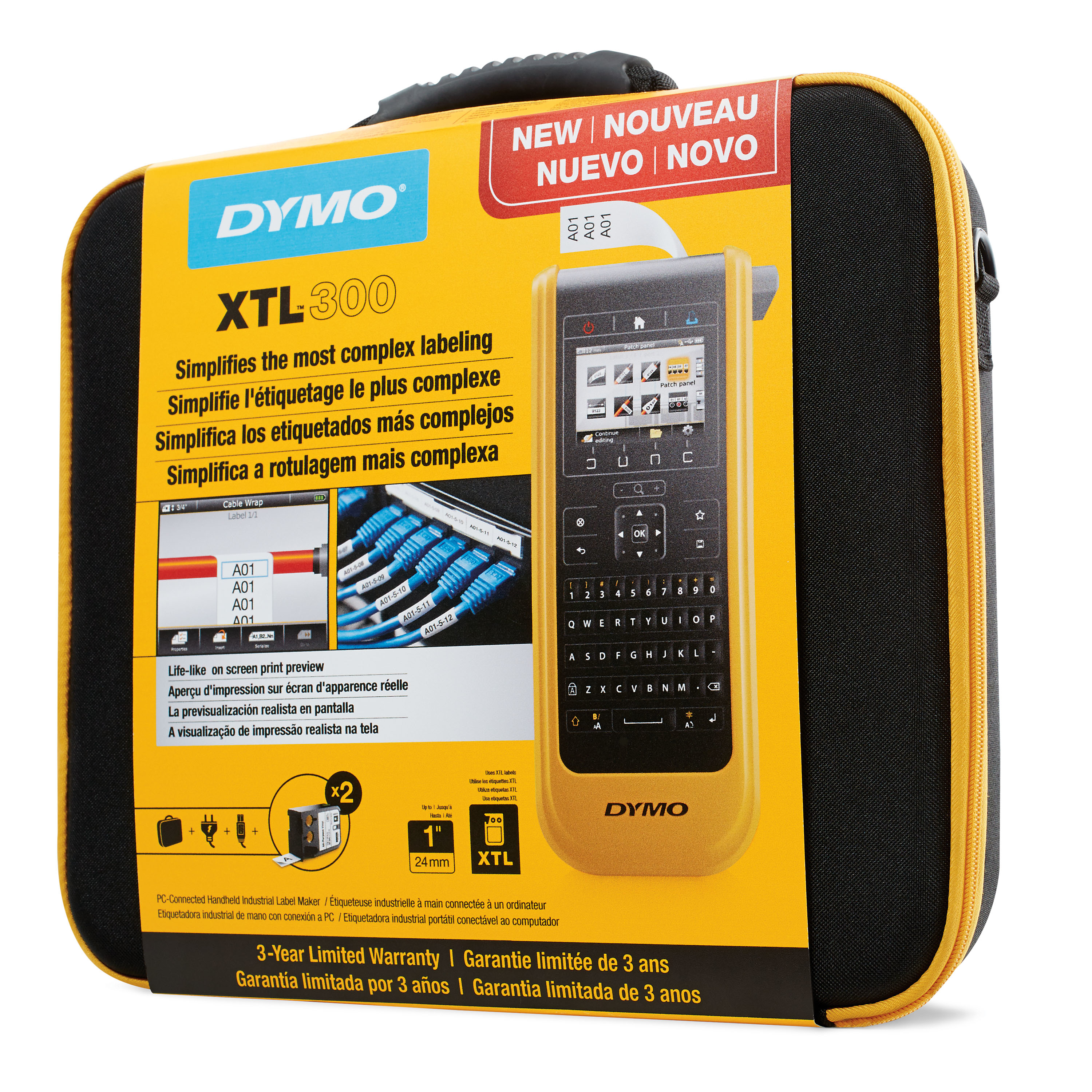 Tired of complicated labelers? Meet the DYMO® XTL™ 300 – the industrial label maker that’s packed with time-saving features to simplify labeling. A life-like on screen print preview and color display show exactly how labels will look, built-in label applications make getting started easy, and pre-loaded label templates for applications like patch panels ensure perfect formatting to save time. The rechargeable XTL™ 300 is toolbox-tough, with impact-resistant bumpers and a wipe-clean keypad. Prints labels from 6 mm (¼”) up to 24 mm (1”) wide in a full range of UL-rated materials and colors. PC connectivity* and DYMO ID software for importing Microsoft® Excel® or database files for printing entire label batches.
