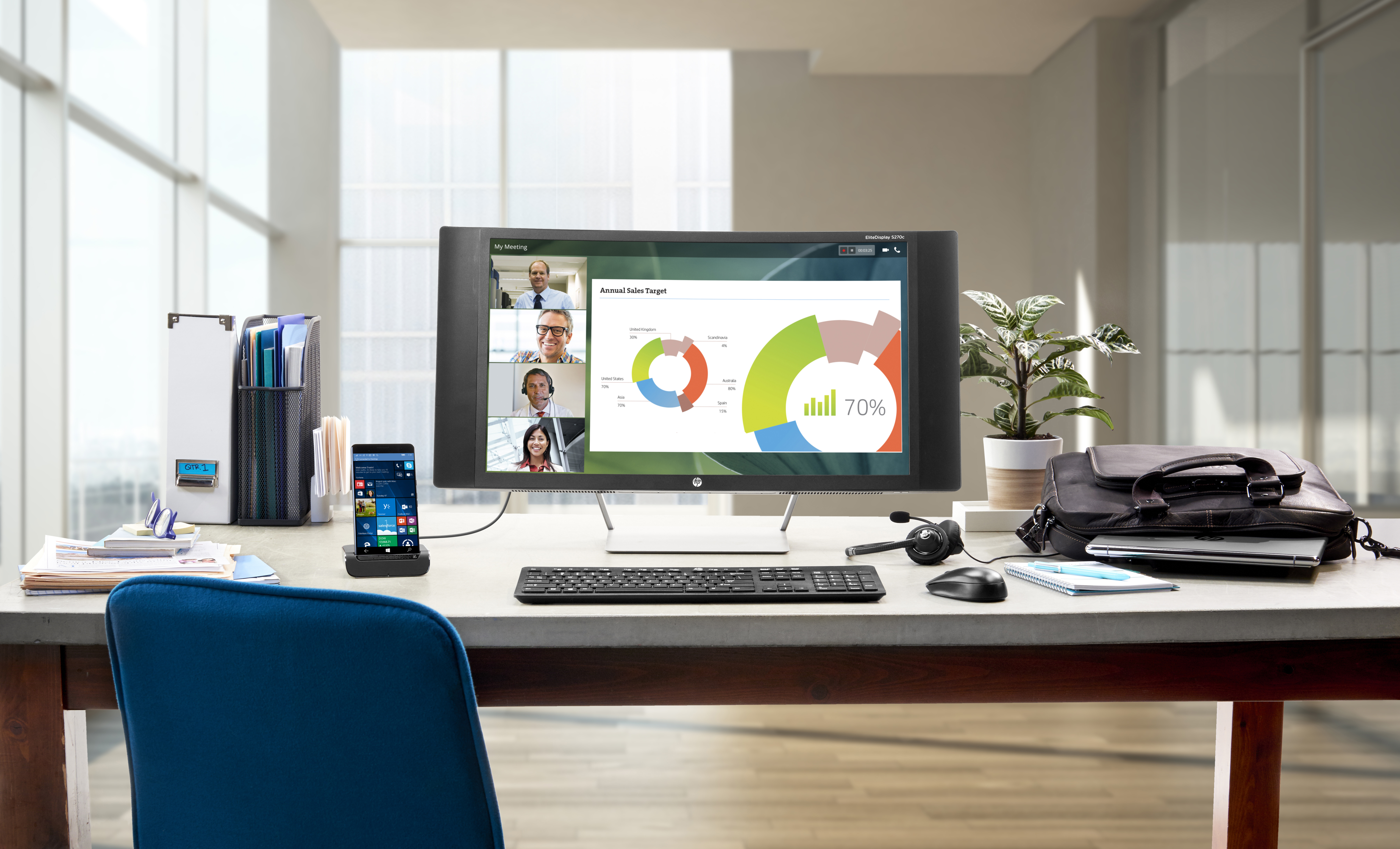 Reinvent your desktop workspace with the ultra-compact HP Desk Dock, which quickly charges your HP Elite x3 and uses its pocket-sized PC power to maximize your Windows 10 Mobile<sup>[1]</sup> productivity on an external display, keyboard, and mouse.<sup>[2]</sup>